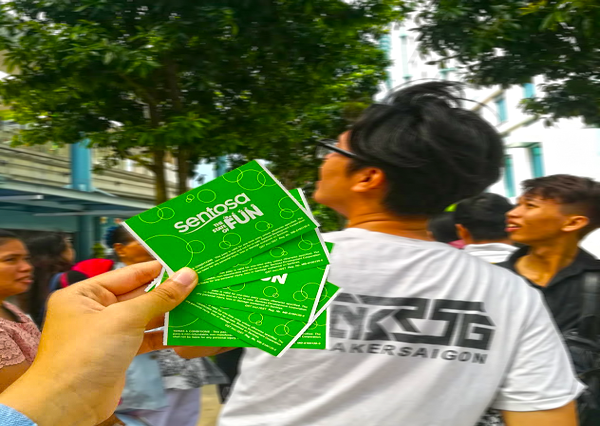 Để vào Sentosa thì bạn sẽ phải đi MRT riêng dành cho đảo Sentosa. Đến nơi thì mua vé vào cổng, vé vào cổng nó sẽ như này: